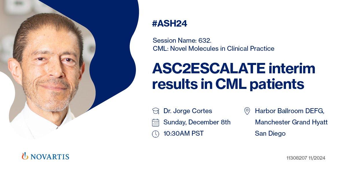 Join Dr Jorge Cortes as he shares interim results from Phase 2 ASC2ESCALATE trial for patients with chronic myeloid leukemia. 🗓️ Sunday December 8 ⏰ 10:30AM PST 📍 Harbor Ballroom D-G, Manchester Grand Hyatt San Diego #Novartis at #ASH24 #hematology https://novartis.social/6011WNnQ7