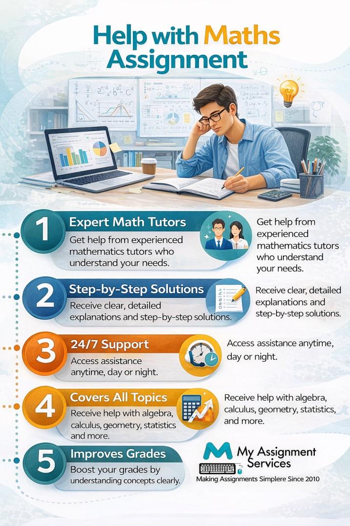 Struggling with formulas, calculations, or complex problem-solving? Get reliable academic support designed to simplify learning and boost confidence. Our experienced tutors provide step-by-step solutions, clear explanations, and on-time assistance for all math levels. From algebra and calculus to statistics and advanced topics, we focus on accuracy and results. Choose professional help with maths assignment to reduce stress, improve grades, and master concepts with personalized guidance and complete academic integrity.